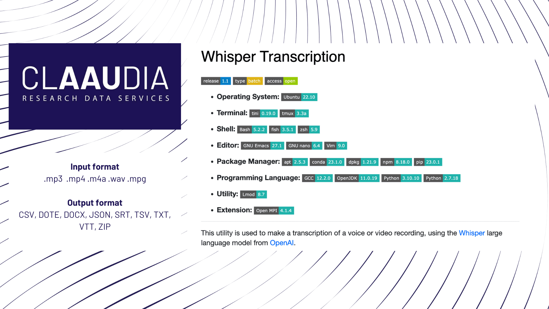 CLAAUDIA's new transcription tool is a valuable resource for researchers working with qualitative data such as interviews, as it often contains confidential or sensitive information and therefore needs to be handled and stored securely. With Whisper Transcription, researchers can get help transcribing their data without compromising security. The application is available in version 1.0 on DeiC's interactive HPC platform, UCloud, which provides a secure infrastructure that allows researchers to safely upload and store both confidential and sensitive data on the platform. In fact, the application is the only AI-based transcription solution for Danish researchers that guarantees that their data is stored securely and locally on Danish servers at DeiC.