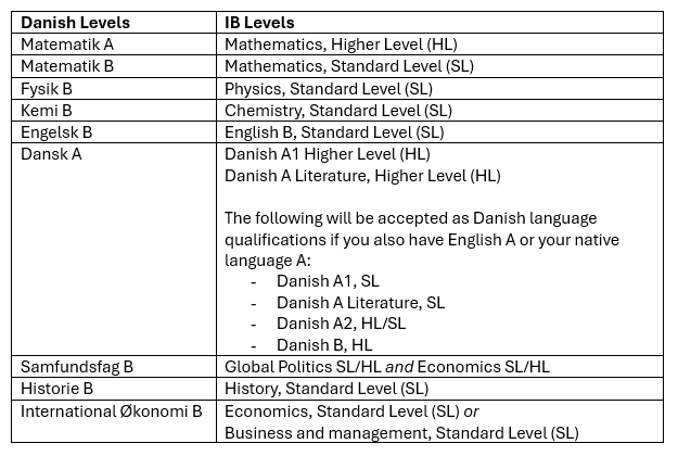 All other programmes require Danish at A-level or the Study Test in Danish as a Second Language. If your Language A HL/SL or B HL or Language A Literature HL/SL is not Danish, Norwegian or Swedish, you need to pass the Danish language test ‘Studieprøven i dansk’